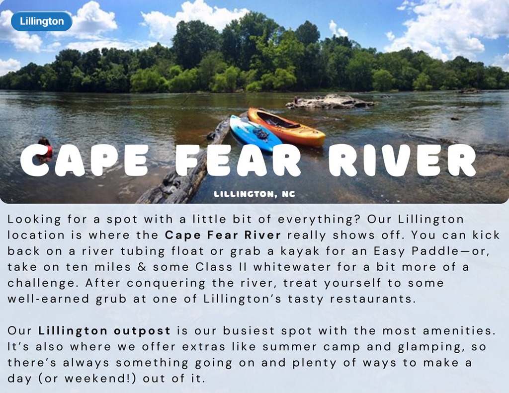 Enjoy an easygoing kayak or paddle board float from the Hwy 421 Access to Camelback Bridge. Paddle beneath historic train trestles and explore the river shallows near old Native American fish traps.