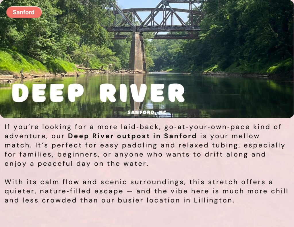Launch from Camelback Bridge and paddle 5 calm miles to Hwy 15‑501, passing the historic Endor Iron Furnace along the way. This scenic, wildlife‑rich flatwater route is perfect for beginners or anyone craving a peaceful day on the river.